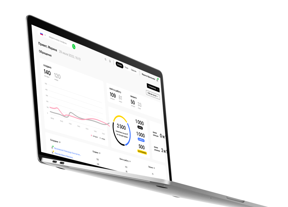 отображение данных за текущие сутки: количество обращений по тематикам, график звонков в сравнении с предыдущим днём, количество и скорость обработки звонков и обращений сотрудниками, анализ обработанных обращений по рабочим группам